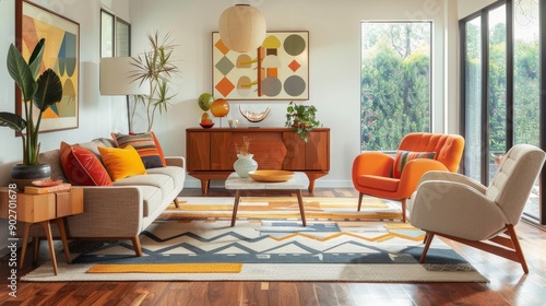 Envision a stylish living room with mid-century modern furniture, bold colors, and geometric patterns.