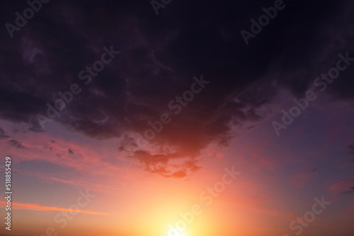 Epic dramatic sunset, sunrise on storm sky with dark clouds, orange yellow sun and sunlight