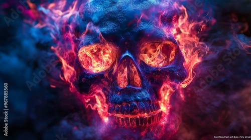 Epic skull surrounded by neon flames and glowing bones creating a dramatic scene in the dark.