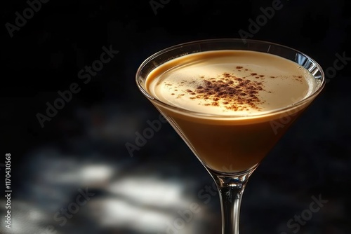 Espresso Martini Close-Up in Sleek Glass on Dark Background with Soft Light Highlighting Creamy Texture