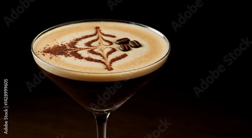 Espresso martini cocktail in martini glass decorated with three coffee beans and cocoa art on black background nightlife drink alcohol beverage at bar counter