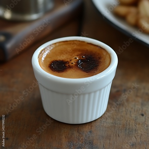 Espresso shot in a small white ceramic cup on a wooden surface