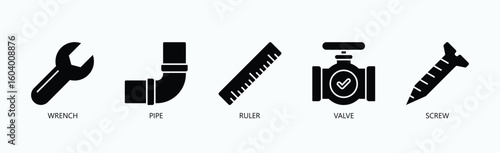 Essential Tools And Components For Mechanical Work Icon Set Vector Illustration Concept With Icon Of Wrench, Pipe, Ruler, Valve, Screw In Glyph Style