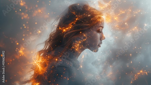 Ethereal Double Exposure of a Woman's Silhouette with Sparkling Lights and Dreamy Clouds
