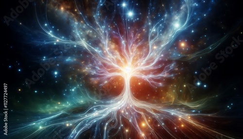 ethereal glowing cosmic tree with radiant light branches extending into a star filled sky