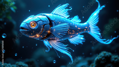 Ethereal koi fish with glowing technology elements in underwater setting.