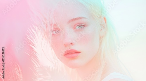 Ethereal Portrait with Featherlike Patterns and Soft Color Overlays