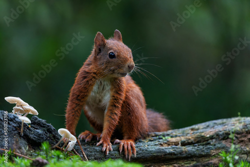 Eurasian red squirrel (Sciurus vulgaris) searching for food in the autumn in the forest in the South of the Netherlands.