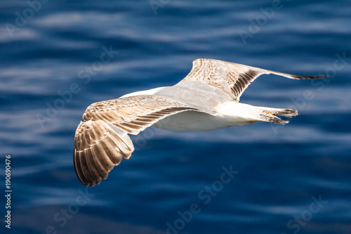 European herring gull, seagull (Larus argentatus) flying in the summer along the shores of Aegean sea near Athens, Greece