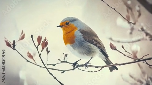 European Robin Bird Perched on Branch Winter Scene Soft Colors