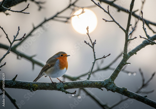 European Robin on Frosty Branch – Winter Sunrise Silhouette Closeup