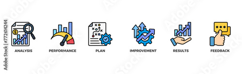 Evaluation banner web icon with analysis performance plan improvement results and feedback icon