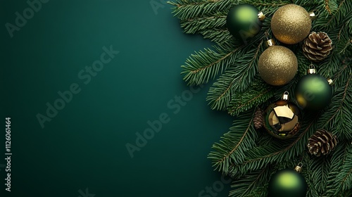 Evergreen Pine Branches With Golden Ornaments Snowflakes on Dark Background Creating Elegant Festive Scene