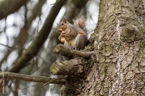 Exemplary of Sciurus Carolinensis, the gray squirrel native of North America that populates some Italian parks in the Region of Lombardy, Piedmont and Liguria