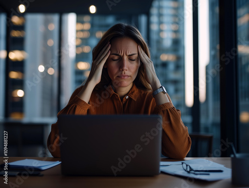 Exhausted Professional Woman Working Late in Office, Hands on Head