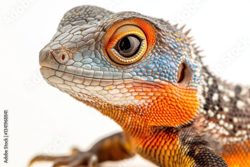 Exotic lizard showcasing vivid colors and striking features in a close-up view on a plain background