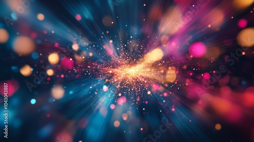 Expansion of particles bursting from the center, representing life, motion, and energy. A blurred explosion backdrop illustrating high-speed movement.