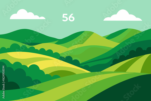 Expansive Sunny Countryside Illustration with Rolling Hills and Fields