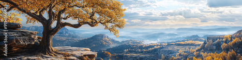 Expansive view of an autumn tree on a cliff overlooking rugged landscape transitioning into winter, evoking a sense of wonder and tranquility.