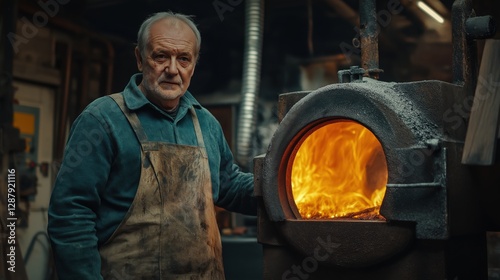 Experienced blacksmith standing near glowing forge in traditional workshop