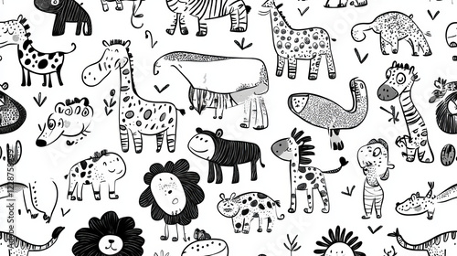"explore whimsical kids animal pattern: cute cartoon african safari wildlife in stylized monochrome black and white illustrations for printable decor design"