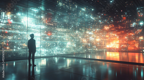 Exploring a vibrant illuminated cityscape through modern glass walls at sunset