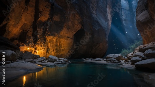 Exploring Serene Canyon with Reflective Water and Glimmering Light Beams