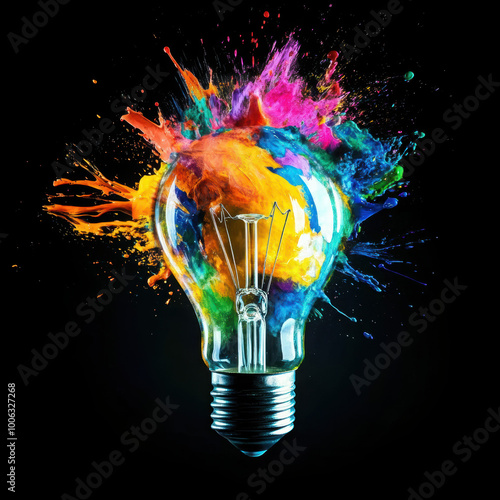 Explosive Inspiration: A light bulb explodes with vibrant color against a black background, symbolizing the power of innovation and creativity.
