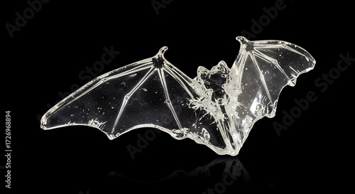 Exquisite Clear Glass Bat Sculpture Isolated on Black Background, Translucent Crystal Art, Reflective Detail