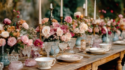 Exquisite floral centerpiece on rustic wooden table for celebration feast