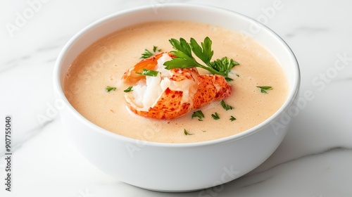 Exquisite Lobster Bisque Elegance with Garnish in Fine Dining Setting, Gourmet Soup Presentation with Copy Space for Text, Generative Ai