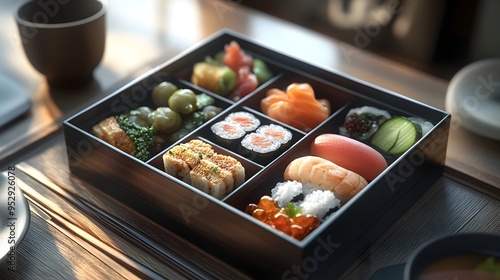 Exquisitely Arranged Traditional Japanese Bento Box with Sushi Sashimi and Pickles