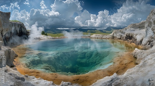 Exquisitely Detailed Panoramic Art of Waiotapu's Enigmatic Geothermal Lake Featuring Vibrant Cascades, Intricate Rock Formations, and Surreal Atmospheric Drama