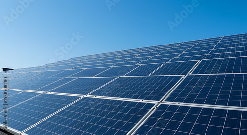 Extensive Solar Panel Array Against a Clear Blue Sky.