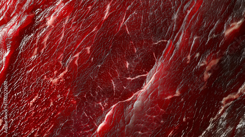 Extreme close-up of raw beef texture highlighting marbling and muscle fibers