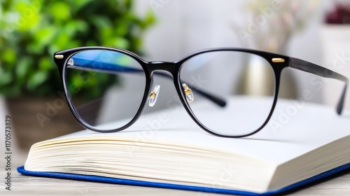 Eyeglasses resting on an open book with blurred greenery in the background.