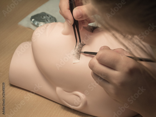 Eyelash extension. Student learning eyelash extensions on a mannequin.