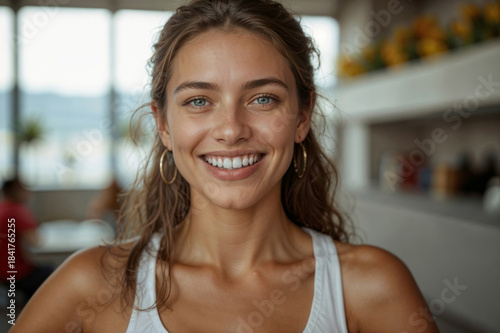 Face of European young woman with long hair and a white tank top is smiling looking at camera, she has a pair of earrings and is wearing a necklace