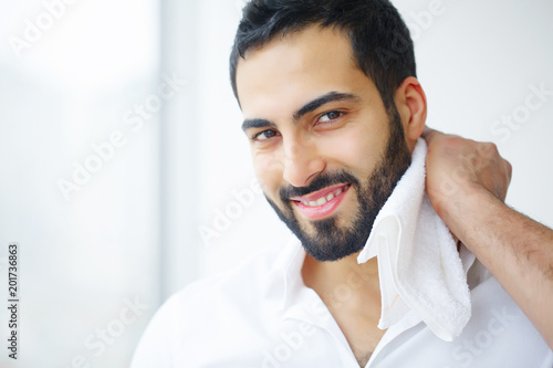 Face Washing. Happy Man Drying Skin With Towel