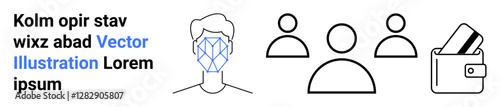 Facial recognition technology overlay on human face, minimalist user group icons, wallet with cards. Ideal for tech, AI, security, user management, finance facial ID digital wallets. Landing page