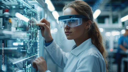 Facility Manager using AR-glasses and AR-technology to fix a machine in a pharma company. Generative AI.