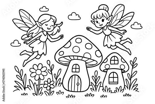 Fairy Mushroom Houses. Magical meadow coloring page: mushroom houses with little windows, fairies flying above, black and white