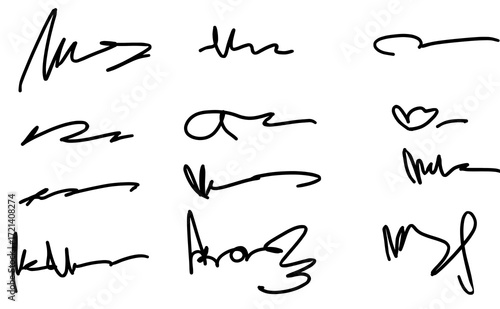 Fake autograph samples. Hand-drawn signatures, examples of documents, certificates and contracts with inked and handwritten lettering. Abstract