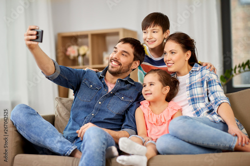 family and people concept - happy father, mother, little son and daughter taking selfie by smartphone at home