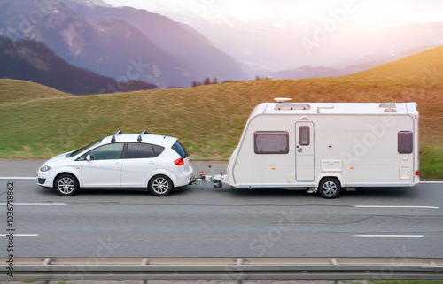 Family Car With RV Van in Mountainous Scenic Landscape During Sunset