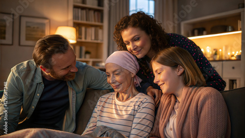 Family gathered around smiling woman with cancer, offering support and encouragement at home