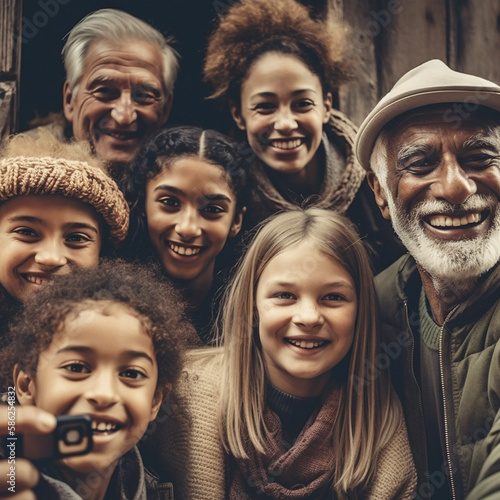 Family, happy portrait and diversity selfie or smile with children, parents and grandparents bonding. Senior men, women and kid face group for ai generated care with love and happiness on holiday