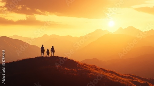 Family on mountaintop at sunset. Silhouettes of a family standing on a hilltop overlooking a vast mountain range bathed in golden light as the sun sets. Warm, serene atmosphere
