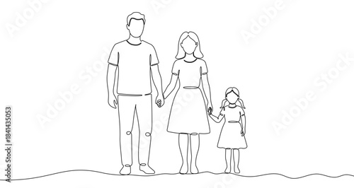 Family parents and one girl holding hands in one line art style. Family drawing with editable black stroke on white background. Vector illustration.