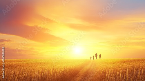 Family Silhouette Sunset Wheatfield Walk
